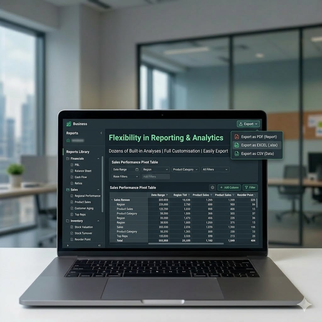 • Access dozens of built-in analyses across core modules, customise reports to your needs, and easily export them into PDF, Excel, or CSV