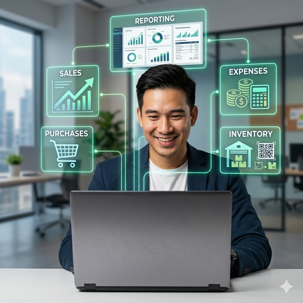 • Sales, purchases, expenses, inventory, and reporting are fully connected